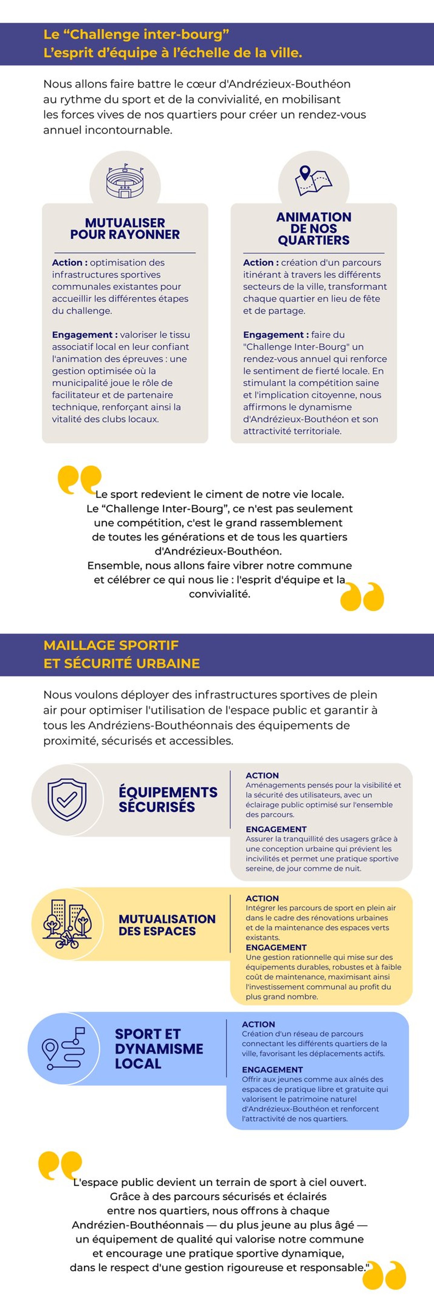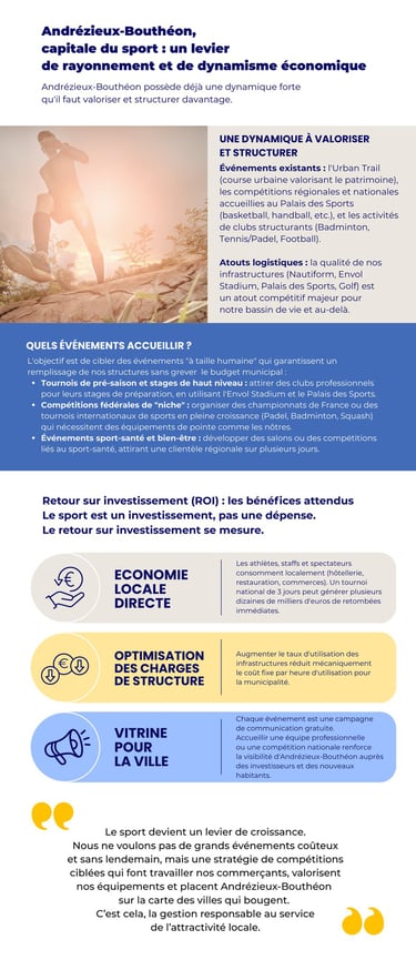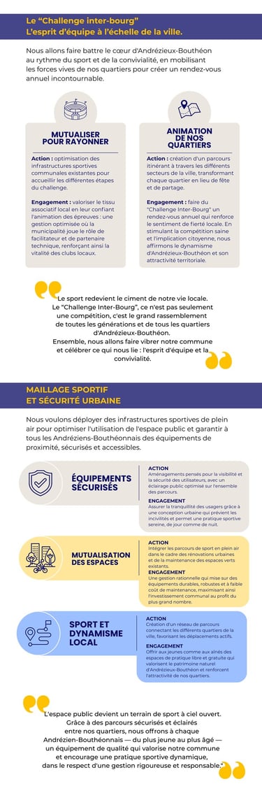 Nous soutiendrons nos clubs en étant juste sur l'attribution des subventions : chaque Andrézien-Bouthéonnais doit pouvoir profiter des mêmes chances et des mêmes structures.